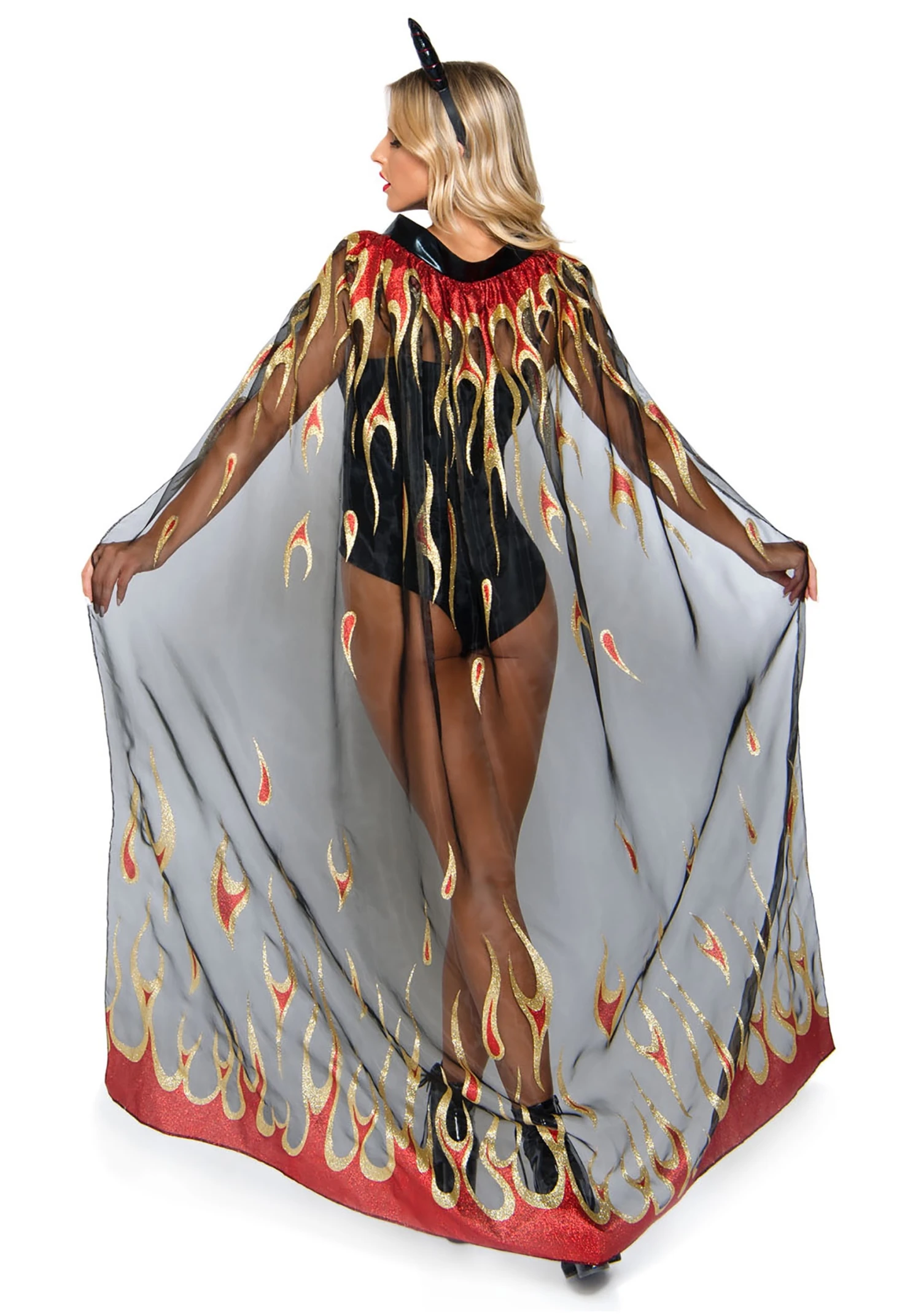 This 2-piece set is the perfect addition to give your devil costume a “fresh from the House of Lucifer” fashion-vibe. The floor-length sheer cape features a bright combination of red, orange, and yellow glittered flames creeping all the way up. You’ll look like you were the one summoned from the netherworld when you stroll into any room with the cape draped around your shoulders and tied with satin ribbon. And whether you don a full face of demon makeup, or keep things natural, the horned headband is sure to provide that final hellishly elegant touch you need!