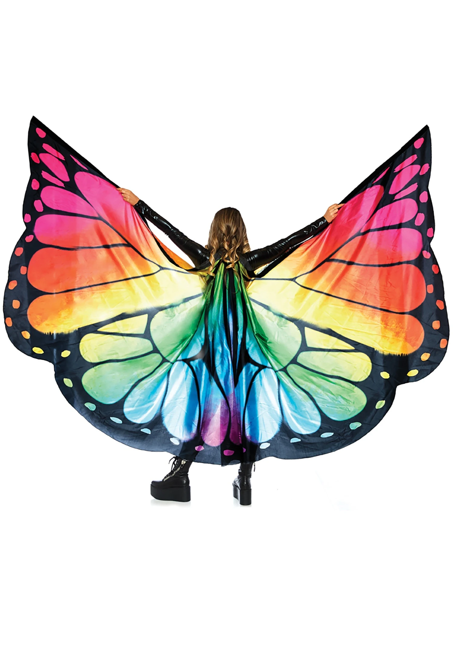 This piece is easy to wear, yet it creates a magical look that’s both ethereal and imaginative! It’s a draped cape that fastens around your neck, with rods that slide onto the top edges to give shape and control. The pattern on the back of the cape, with arms fully extended, is an intricate butterfly wing pattern in ombre rainbow hues. Pair it with a basic black leotard, a full bodysuit, even black denim and a tee, and enjoy the attention you’re bound to garner.Â