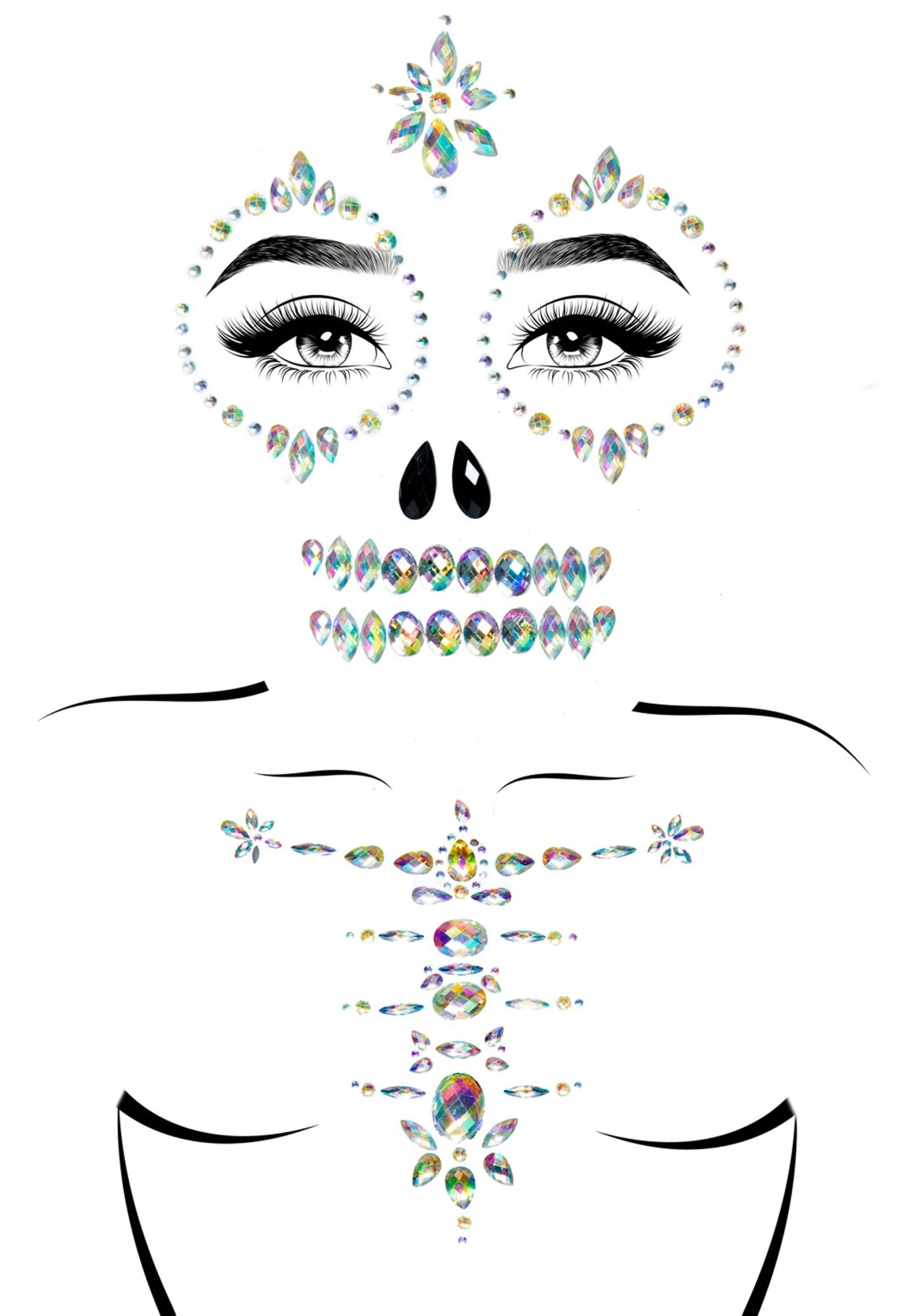 This year, in an effort to bring a spooky new archetype to the Halloween costumes fold, you should assume the role of Madame Muerte, the bedazzled, undead harbinger of things that go bump in the night. She’s got a dangerous expression, a dazzling complexion, and we could swear we saw her crack a wry smile. The jewels in our Skeleton Face & Chest Jewel Adhesive Kit will turn you into this mysterious woman or comprise the base of another spooky costume you have in mind. The irridescent tone with colors such as purple, green, and yellow will dazzle passersby. These shining accessories will make the perfect touch for a Day of the Dead celebration, music festivals, or the next costume party, givcing you the mysterious glimmer of the ghostly.